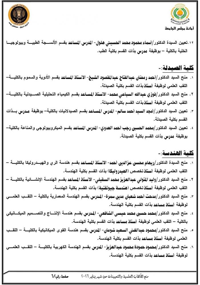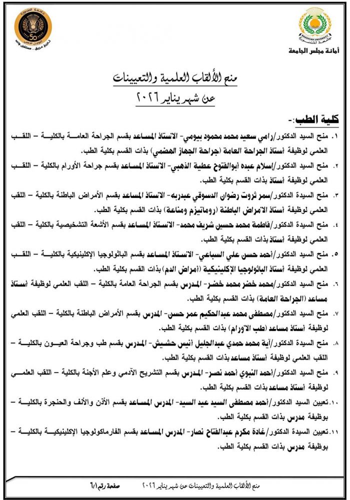 تعيينات وترقيات مجلس الجامعة عن شهر يناير 2026 التعيينات الجديدة الزيارات: 132 تعيينات وترقيات مجلس الجامعة عن شهر يناير 2026 لعرض التفاصيل إضغط على الصور Facebook Twitter