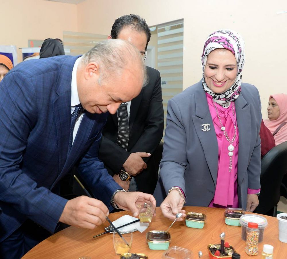 The university president also attended an art workshop titled "Casseroles of Happiness," an innovative workshop conducted by students under the supervision of the Arts Activities Department. The workshop involved students designing and decorating cakes with safe colors, creating an artistic expression that combined skill, creativity, and joy.