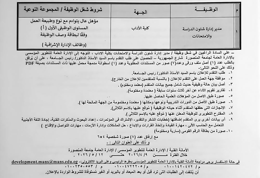 تعلن جامعة المنصورة عن حاجتها لشغل لوظيفة أمين كلية التربية بدرجة مدير عام من داخل الجامعة أو خارجها طبقا لأحكام القانون رقم (5) لسنة 1991 ولائحته التنفيذية الصادرة بقرار رئيس مجلس الوزراء رقم 1596 لسنة 1991 المعدلة بالقرار رقم 781 لسنة 2010 ... التفاصيل |