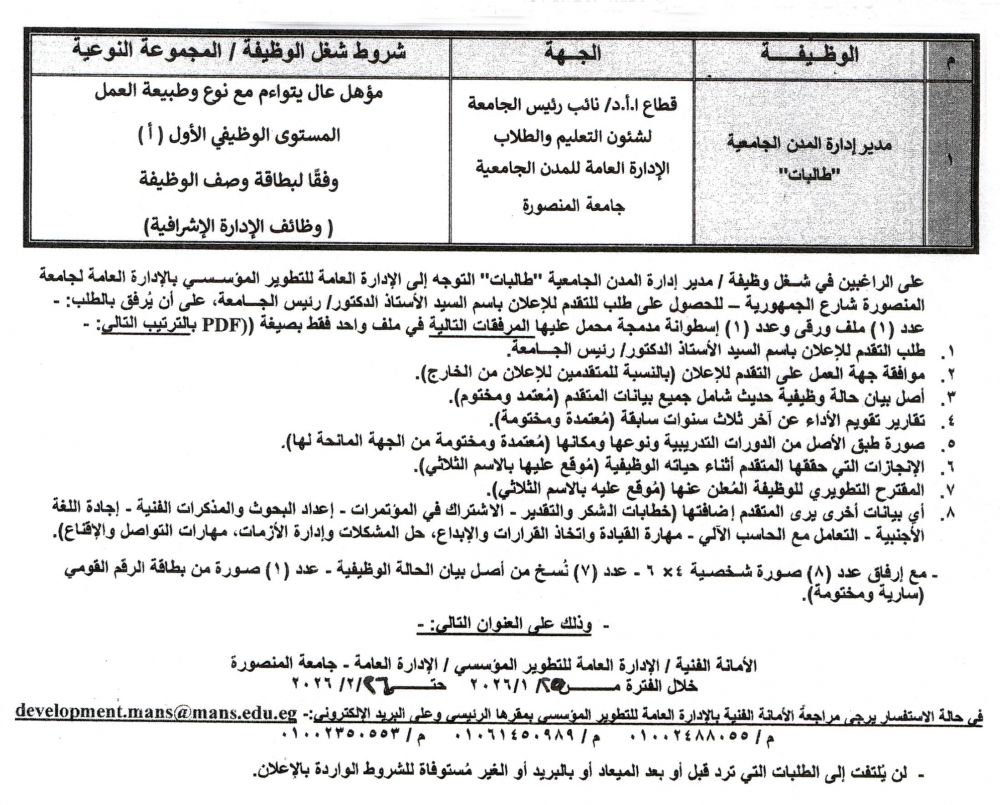| تعلن الإدارة العامة لجامعة المنصورة عن حاجة الإدارة العامة للشئون الطبية ومستشفى الطلبة الجامعي عن شغل وظيـفة سائق سيارة ... التفاصيل | 28/03/2014 |