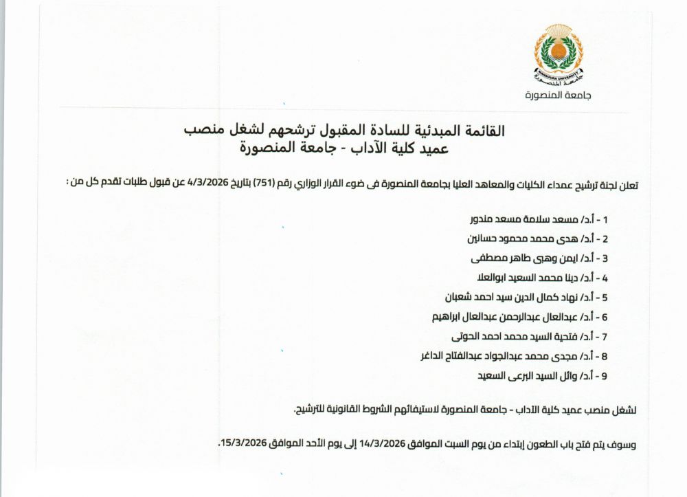تعلن لجنة ترشيح عمداء الكليات والمعاهد العليا بجامعة المنصورة فى ضوء القرار الوزارى رقم (751) بتاريخ 04 / 03 / 2026 عن قبول طلبات تقدم كل من :