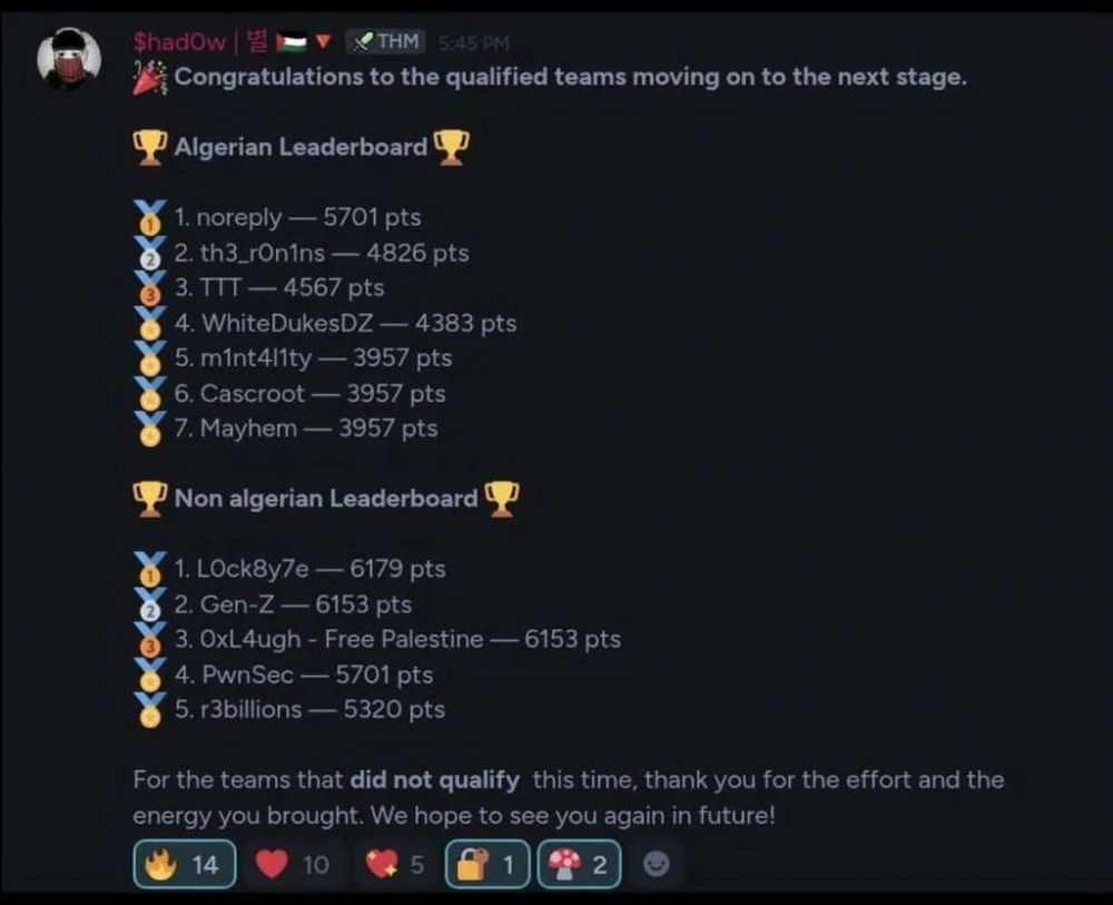 وجاء حصول جامعة المنصورة على المركز الأول إفريقيًا من خلال فريق L0ck8y7e، الذي ضم الطلاب زياد محمد السعيد الرنقراني ببرنامج هندسة الاتصالات والحاسبات (CCE)، وكريم عصام عبدالبديع الشوره، ومحمود أسامة علي، ومحمد وجدي خلف بقسم هندسة الحاسبات ونظم التحكم، فيما حقق المركز الثاني على مستوى القارة الإفريقية فريق Gen-Z، ومثّله الطالب يوسف أيمن ماهر ببرنامج هندسة الذكاء الاصطناعي (AI)، وذلك عقب منافسات قوية بين نخبة من الفرق المتخصصة في الأمن السيبراني بمختلف الدول الإفريقية.