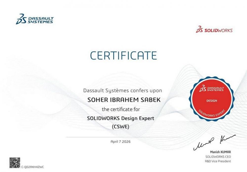 في إنجاز جديد يعكس تميز طلابها وقدرتهم التنافسية، نجح 6 طلاب من كلية الهندسة بجامعة المنصورة في الحصول على شهادة Certified SOLIDWORKS Expert (CSWE)، والتي تُعد أعلى مستوى من الاعتماد الاحترافي في مجال التصميم الهندسي باستخدام برنامج SOLIDWORKS.