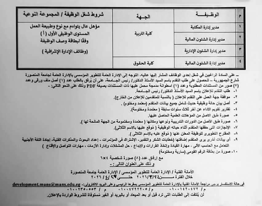 اعلان جامعة المنصورة عن حاجتها لشغل الوظائف الاشرافية التاليه